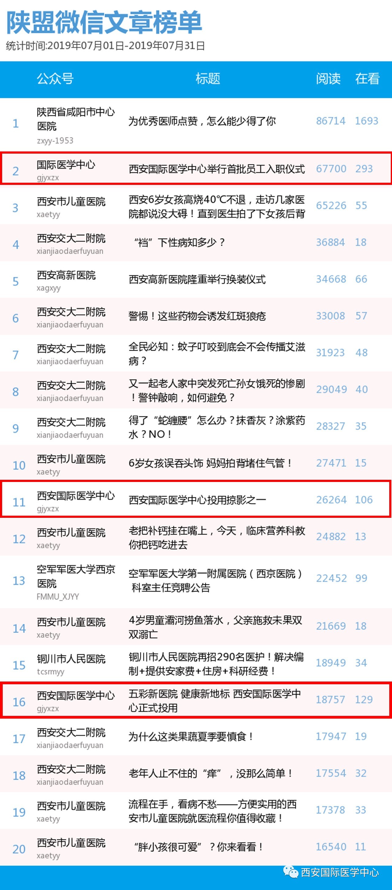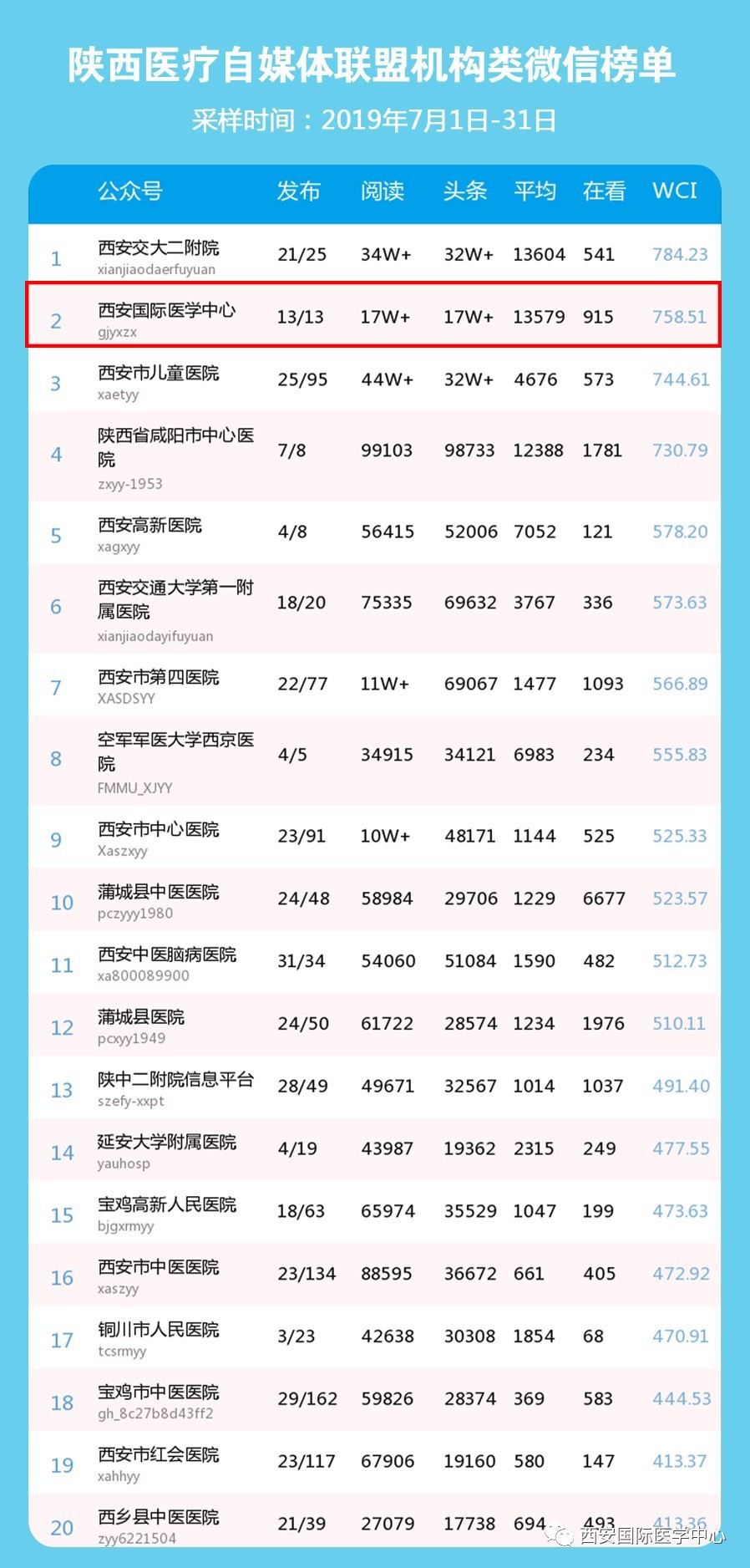 8月2日,中國醫(yī)療自媒體聯(lián)盟陜西分盟醫(yī)療機(jī)構(gòu)類微信公眾號7月份排行榜發(fā)布,西安國際醫(yī)學(xué)中心微信公眾號奪得醫(yī)療機(jī)構(gòu)類榜單第2名,高居“榜眼”。在陜西醫(yī)療自媒體聯(lián)盟的推薦下,西安國際醫(yī)學(xué)中心順利進(jìn)入今日頭條號(醫(yī)療機(jī)構(gòu)),微信文章將同步刊登到今日頭條。