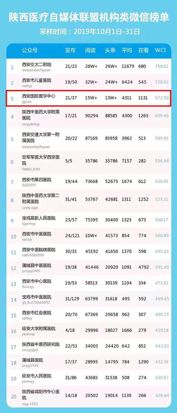 10月榜單數(shù)據(jù):西安國(guó)際醫(yī)學(xué)中心微信公眾號(hào)總閱讀數(shù)15w 、頭條閱讀數(shù)13w 、平均閱讀數(shù)4311、總在看數(shù)1131、微信傳播指數(shù)WCI672.9。