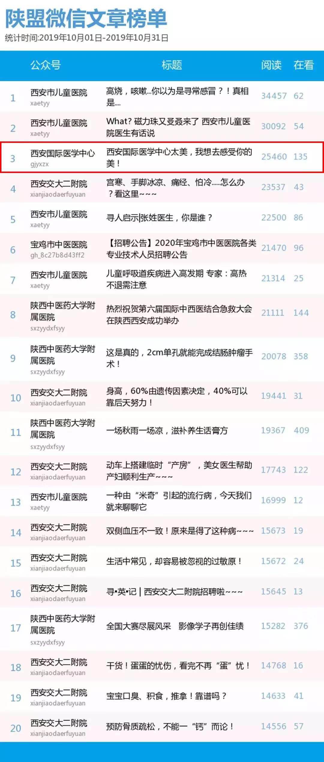 陜西醫(yī)療自媒體聯(lián)盟醫(yī)療機(jī)構(gòu)類微信公眾號(hào)2019年10月微信文章榜單第三名——《西安國(guó)際醫(yī)學(xué)中心太美,我想去感受你的美》。文章從醫(yī)院優(yōu)美的環(huán)境角度切入,詳細(xì)介紹了西安國(guó)際醫(yī)學(xué)中心的地理位置、建筑特色、就醫(yī)環(huán)境、名醫(yī)專家、醫(yī)療惠民等,最終獲得25460的閱讀量,位列第三。