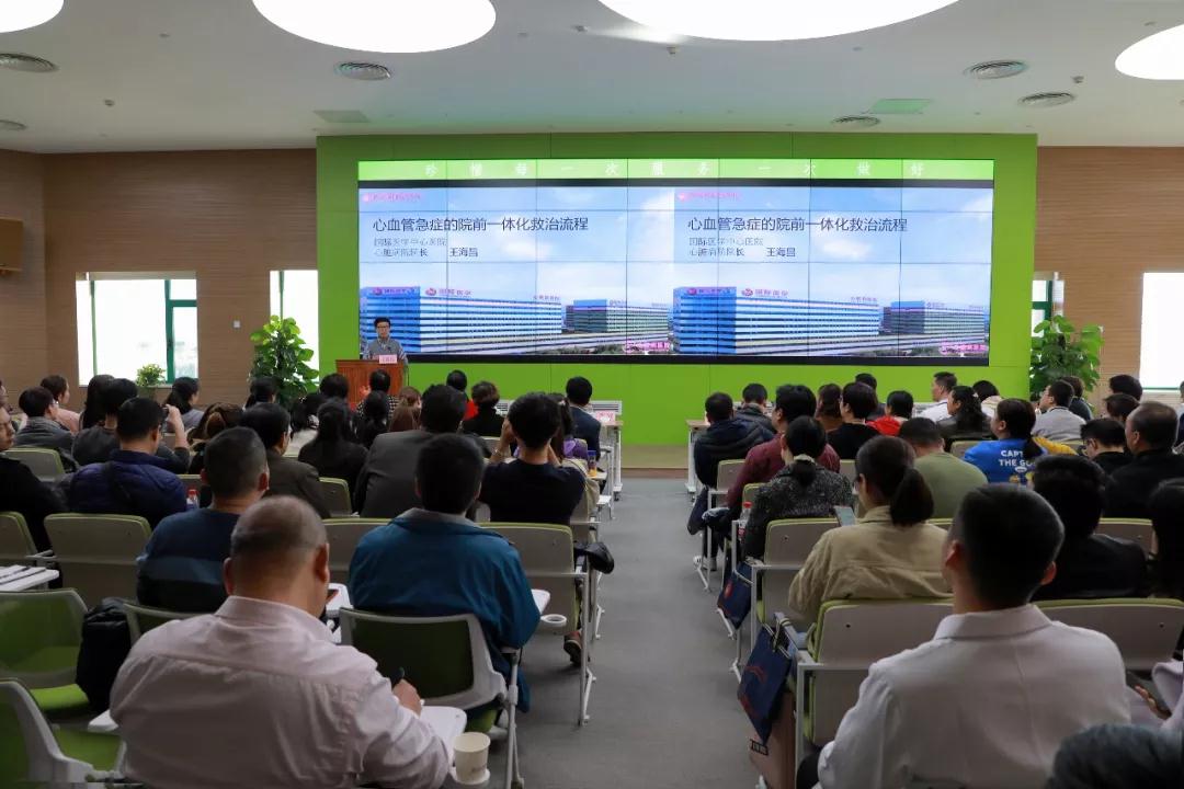 講座環(huán)節(jié),王海昌院長就《心血管急癥的院前院內(nèi)一體化救治》進(jìn)行了詳細(xì)闡述,以大量數(shù)據(jù)強(qiáng)調(diào)了心血管疾病救治過程中把握時間窗的重要性,建議根據(jù)急性冠脈綜合征突發(fā)性、不可預(yù)測的特點,建立完善的院前、院內(nèi)急救網(wǎng)絡(luò)、胸痛中心,協(xié)助120高速有效的運(yùn)轉(zhuǎn);潘僑主任為大家介紹了心梗伴室顫猝死的院前院內(nèi)救治,分析搶救成功的心肌梗死案例,講解了發(fā)生心跳驟?;颊咧?0-95%為心源性,心源性休克首選冠脈介入診療,院前及院內(nèi)急救早期、快速并完全地開通梗死相關(guān)動脈是改善患者預(yù)后的關(guān)鍵。