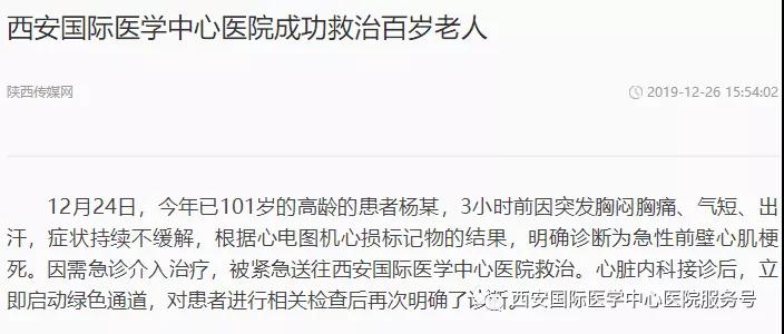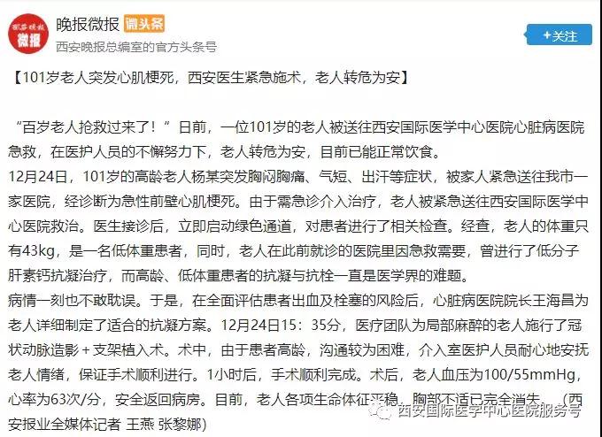 12月24日,心臟病醫(yī)院成功救治了一位101歲的老年患者。心臟病醫(yī)院CCU潘僑主任為患者在局部麻醉下行冠狀動脈造影+支架植入術。目前,患者轉(zhuǎn)危為安,已能正常飲食。
