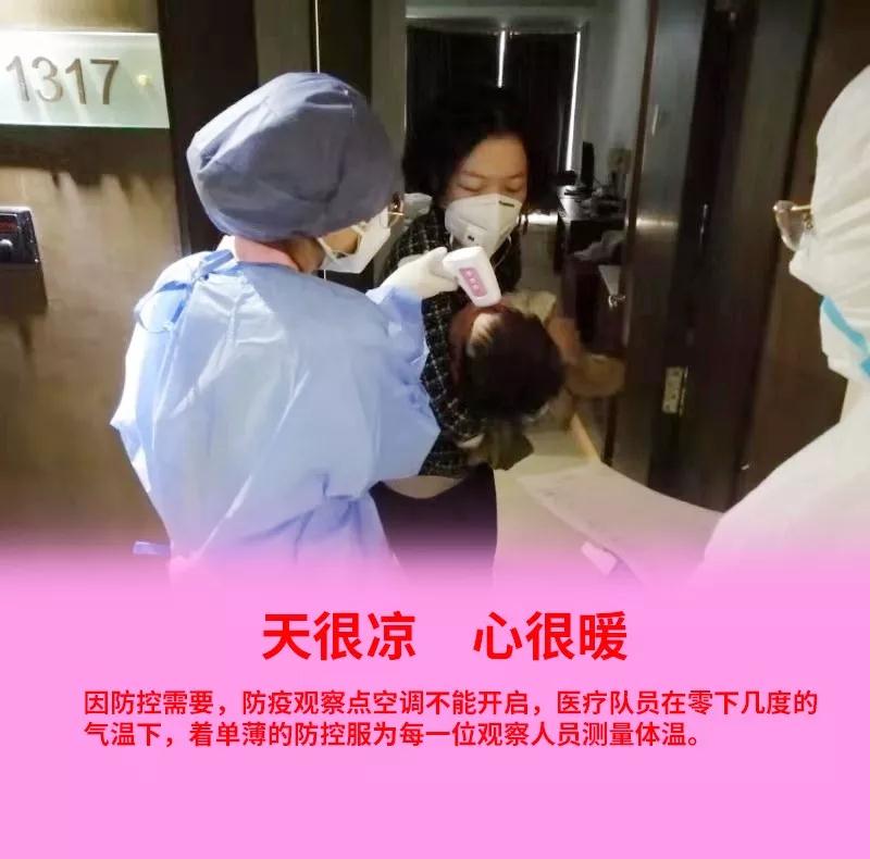 這支醫(yī)療隊由3名醫(yī)生、5名護士組成,分別是房武寧、張曉敏、王婧3位醫(yī)生;護士為白容容、陳蕓、王亞馨、燕瑞娥、田橋。身穿不透氣的防護服,醫(yī)護人員時時刻刻與時間拼耐心、與疫情變化拼細心。留觀人員中有16名70歲以上的老人,6名3歲以下的兒童。他們體質(zhì)較弱,需要更多的關(guān)懷與呵護。護士王亞馨每天要在樓上往返7、8趟為他們測體溫、安撫情緒。“我也時常想念家人,春節(jié)沒法和他們一起過年?,F(xiàn)在,這里的老人和孩子就是我的家人?!闭f著,豆大的汗珠順著她的眼睫毛滑落。即便超負荷工作著,她也從未喊過苦叫過累。