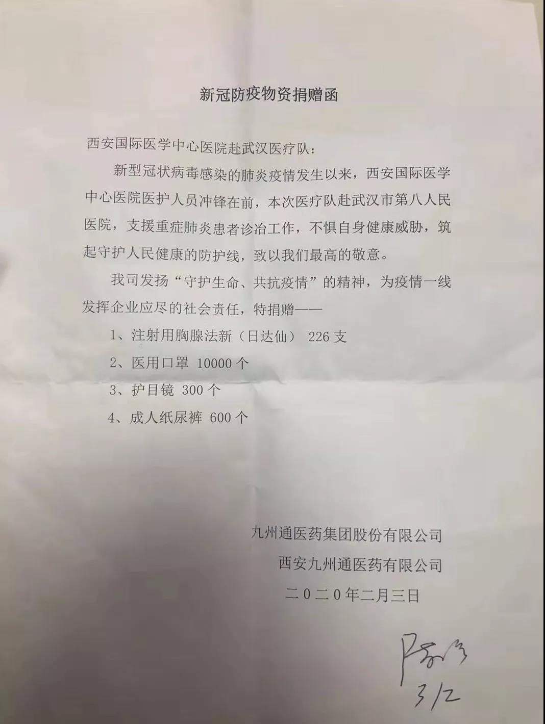 2月3日,九州通醫(yī)藥集團(tuán)股份有限公司、西安九州通醫(yī)藥有限公司捐贈(zèng):注射用胸腺法新(日達(dá)仙)226支、醫(yī)用口罩10000個(gè)、護(hù)目鏡300個(gè)、成人紙尿褲600個(gè)。