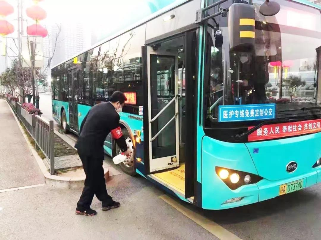 疫情期間,西安市公交五公司為醫(yī)院開通專線公交車(地鐵3號(hào)線延平門站?西安國際醫(yī)學(xué)中心醫(yī)院),為醫(yī)務(wù)人員提供免費(fèi)通勤服務(wù)。公司還嚴(yán)格執(zhí)行駕駛?cè)藛T測量體溫和車輛消毒的規(guī)定,保障醫(yī)務(wù)人員用車絕對(duì)安全。