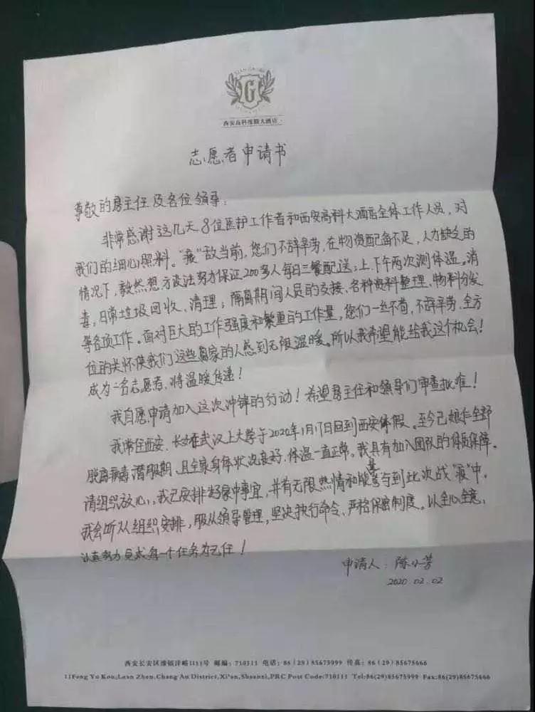 2月1日,解除留觀回家,陳小芳想當志愿者的想法獲得了家人的鼓勵支持。緊接著,她向高新區(qū)留觀點臨時黨支部遞交了志愿者申請書。其中寫道:“面對巨大的工作強度和繁重的工作量,您們一絲不茍,不辭辛勞,全方位的關懷使我們這些離家的人感到無限溫暖。所以我希望我也能成為一名志愿者,將溫暖傳遞,我自愿申請加入這次沖鋒行動!”