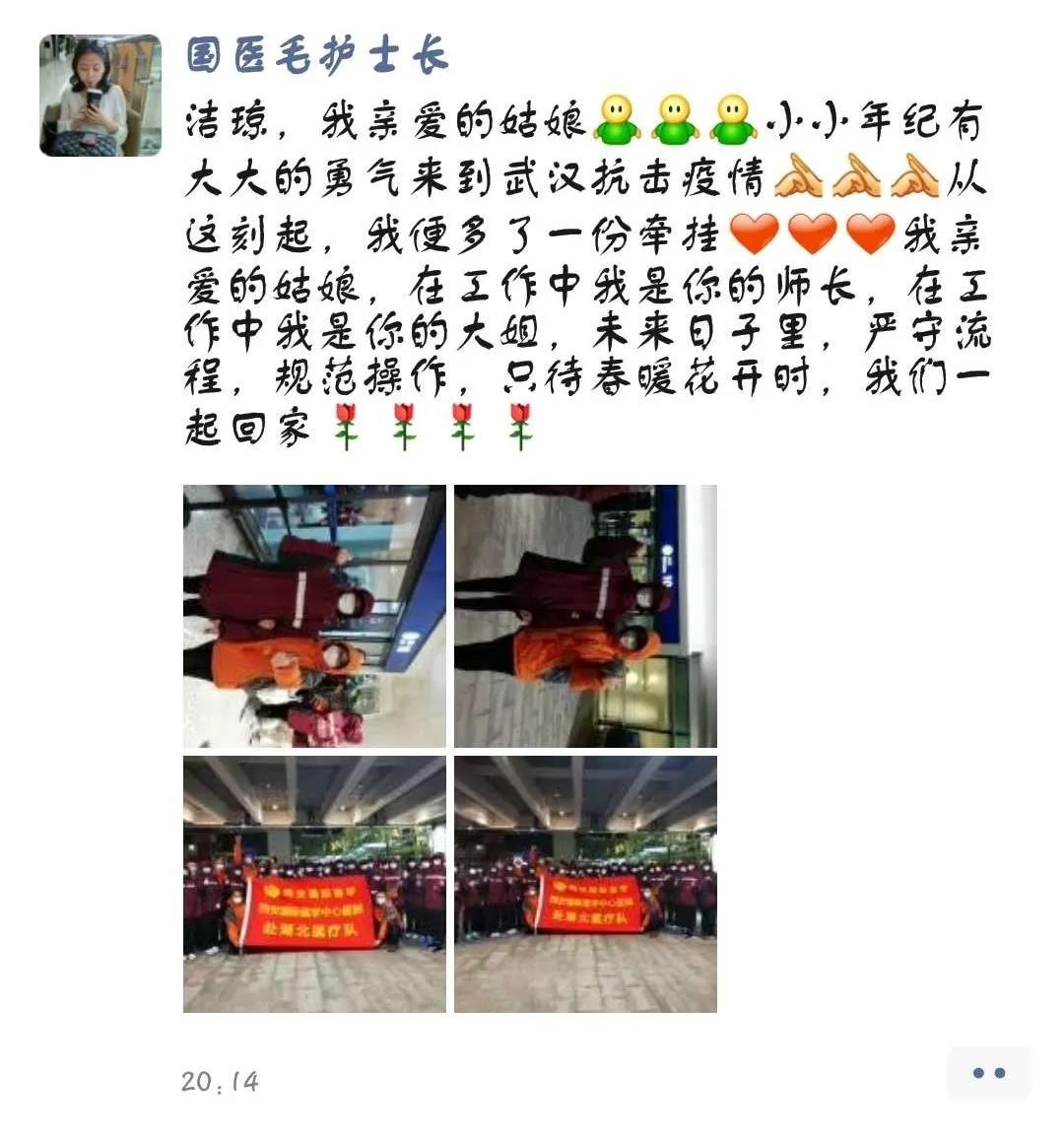 “潔瓊,我親愛的姑娘,小小年紀(jì)有大大的勇氣來到武漢,抗擊疫情,從這刻起,我便多了一份牽掛,我親愛的姑娘,在工作中我是你的師長,在生活中我是你的大姐姐,未來日子里,嚴(yán)守流程,規(guī)范操作,只待春暖花開時(shí),我們一起回家?!边@些話中充滿了護(hù)士長對(duì)潔瓊的鼓勵(lì)、疼惜、牽掛以及對(duì)抗擊疫情必勝的信心,我親愛的戰(zhàn)士們,加油,我們與你同在。