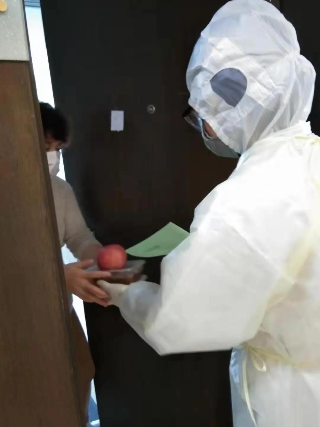在這里的每一天,“累”是所有醫(yī)務工作者的共同感受,因為隔離點接受的大都是從武漢回來的人群,所以我們都要做好三級防護的自我保護措施。這里被隔離者都是我們的親人,生活起居,心理輔導,事無巨細都由我們照料。記得剛來的那幾天,穿著不透氣的隔離衣給留觀者送餐時,送到一半時突然感覺自己呼吸不暢,后面的衣服都濕透了,怕自己撐不住,趕快跑到安全通道脫下面罩,解開隔離衣,那一刻好想休息片刻,但是看著箱子里的飯菜,我又重新穿起了隔離衣。我的放松會讓飯菜變涼,家人們吃了會不舒服。想到這里,我邁出堅定的步伐,加入到戰(zhàn)斗中。