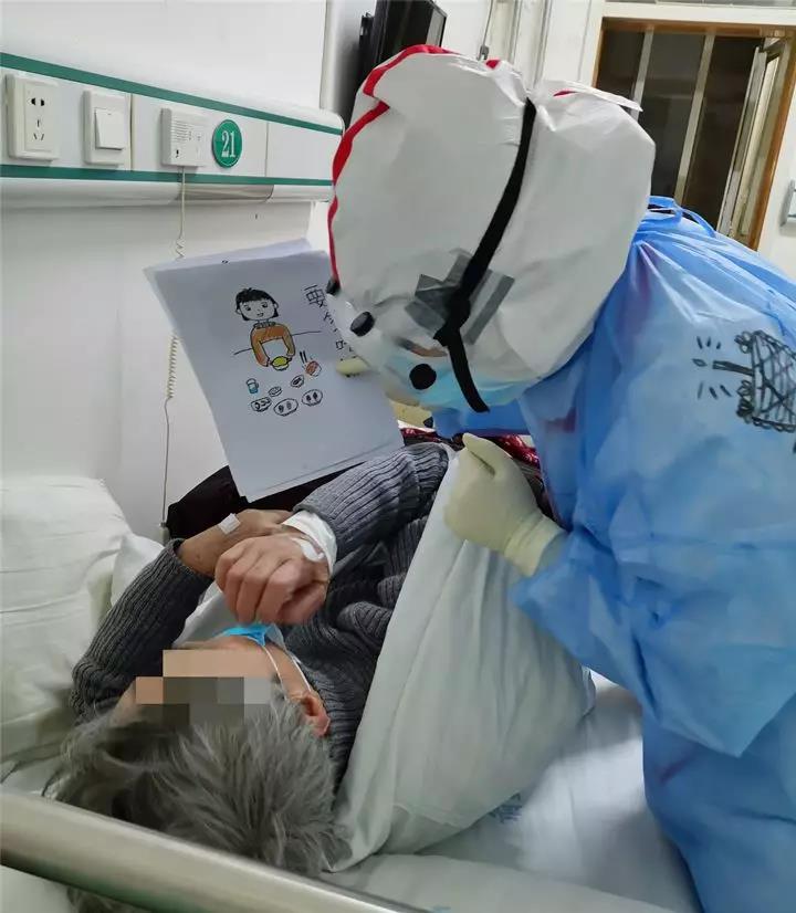 車敏鑫并沒(méi)有放棄,依然耐心的用肢體動(dòng)作比劃著、交流著,大致了解奶奶的意思,并給奶奶找來(lái)水杯、臉盆等生活用品。夜間奶奶體溫突然升高到38.3℃,車敏鑫邊比劃著給老奶奶喂水,比劃著叮囑老人發(fā)燒期間要多喝水,和老人一同入院的患者告訴車敏鑫這位奶奶從下午到現(xiàn)在一直沒(méi)吃飯,醫(yī)院發(fā)的米飯老太太也咬不動(dòng)。聽(tīng)到這車敏鑫立馬聯(lián)系樓上的兩個(gè)病區(qū)帶來(lái)一份粥和一包豆?jié){。有人問(wèn)她為何這么耐心地照顧奶奶,她總是溫暖的笑著說(shuō):“這個(gè)奶奶和我奶奶年紀(jì)差不多大,我是奶奶帶大的孩子,心里就想多幫一幫她。”