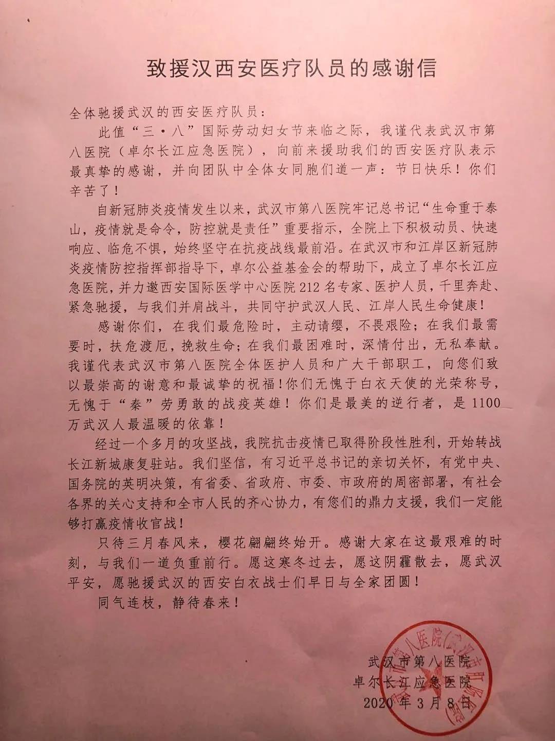 “感謝各位白衣天使,你們是1100萬武漢人最溫暖的依靠!是八院全體同仁親密無間的戰(zhàn)友!”武漢市第八醫(yī)院唐迎春書記說。
