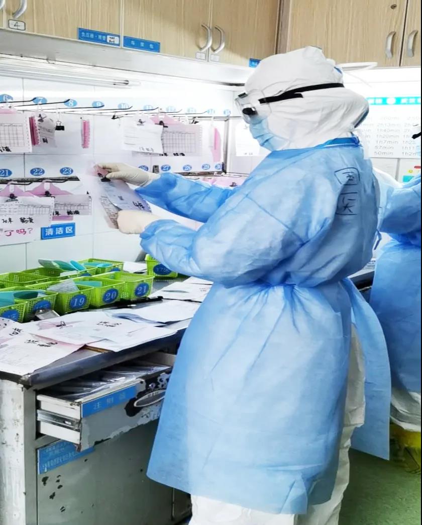一線臨床的治療和護理工作,是真正考驗技術(shù)的環(huán)節(jié)。加藥配藥嚴格無菌操作、雙人核對。戴著多層防護手套工作,一雙“大手”小心翼翼拿取每一小支安瓿抽吸藥液時稍顯笨拙,但是護士說:“現(xiàn)在加藥的姿勢可能有點狼狽,但是我沒有浪費一滴藥,這都是在科室練出來的基本功。”