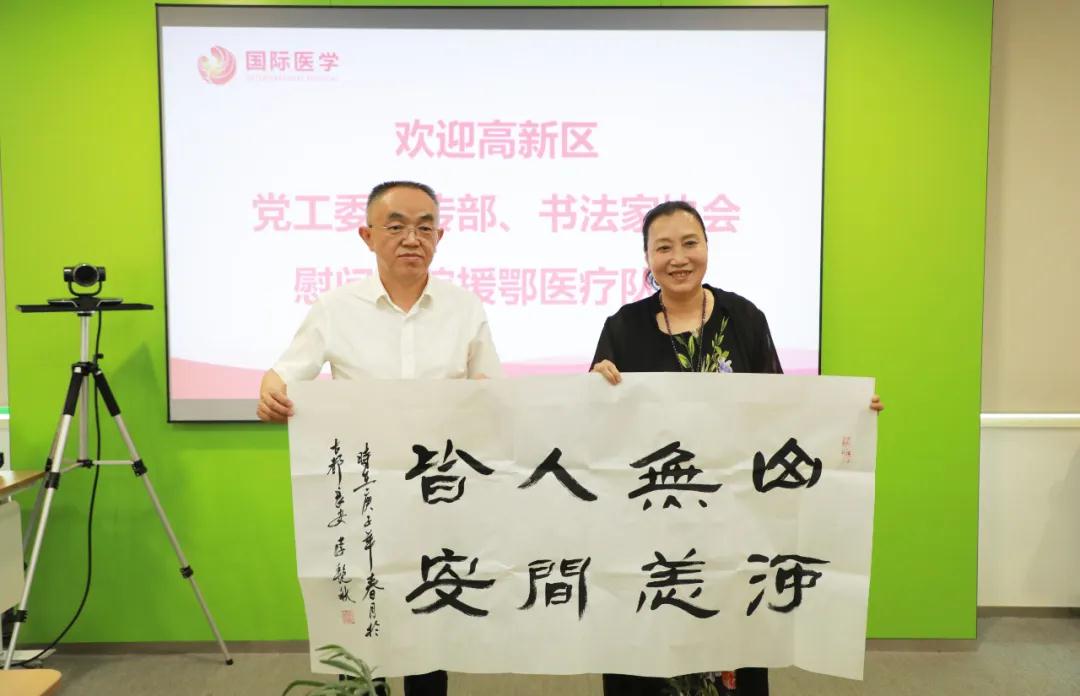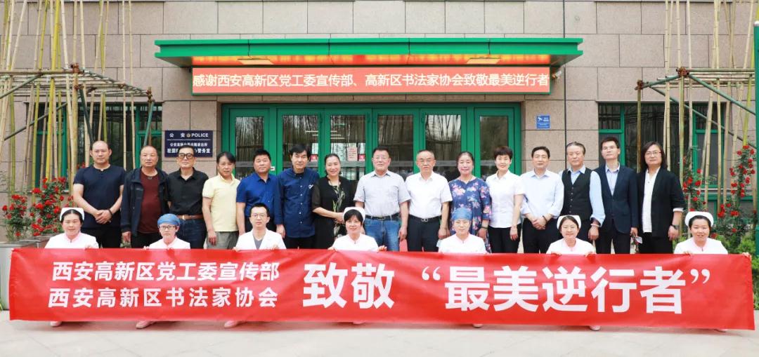 陜西省書(shū)協(xié)副主席、高新區(qū)書(shū)法家協(xié)會(huì)主席李艷秋,陜西省書(shū)協(xié)女書(shū)法家委員會(huì)委員、高新區(qū)書(shū)法家協(xié)會(huì)常務(wù)副主席兼秘書(shū)長(zhǎng)曹京梅,高新區(qū)書(shū)法家協(xié)會(huì)副主席王強(qiáng)、閆瑞、吳建軍以及書(shū)法家劉鵬飛、高瑞成、馮傳金、胡江濤、郭小和、段西漢等前來(lái)慰問(wèn)。陜西省書(shū)協(xié)副主席李艷秋高度贊揚(yáng)了我院支援湖北醫(yī)療隊(duì),隊(duì)員們不辱使命、載譽(yù)而歸,以實(shí)際行動(dòng)詮釋了白衣天使的初心,是新時(shí)代最可愛(ài)的人?!搬t(yī)者仁心”“人間大愛(ài)、可歌可頌”……一幅幅蒼勁有力的書(shū)法作品致敬白衣戰(zhàn)士,贊美之情躍然紙上。