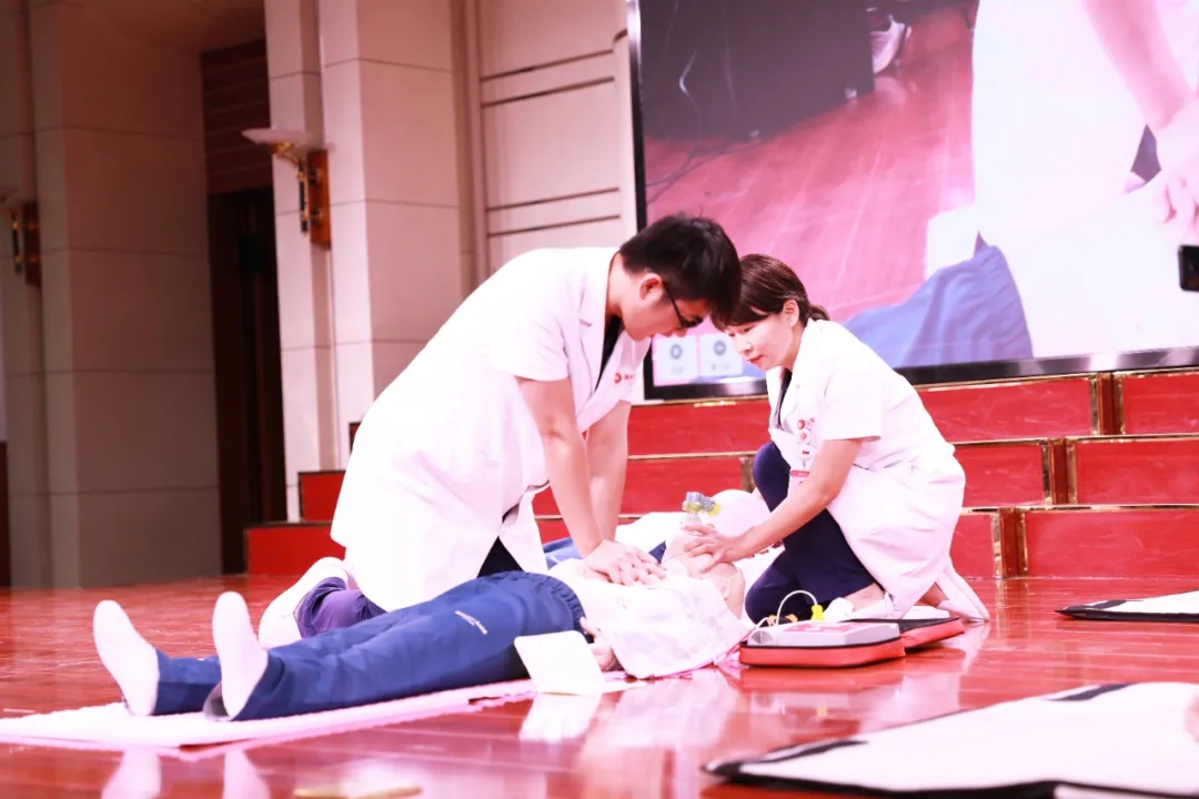 在多功能廳,王彬榮副主任進行理論授課;呂玉珠醫(yī)生、張榮榮護士長、許哈克分別進行了成人、兒童、嬰兒心肺復蘇術(shù)(CPR)模擬演練、體外自動除顫器(AED)的使用、海姆立克法、嬰兒氣道梗阻的緊急處理方法等操作演示,并以互動的方式邀請12名學生代表上臺進行了操作練習,老師們現(xiàn)場進行一對一的指導,為大家解答各種疑問,使他們對現(xiàn)場心肺復蘇術(shù)的全過程有了更加深刻的理解,也使學生們基本掌握了心肺復蘇法的操作技能。