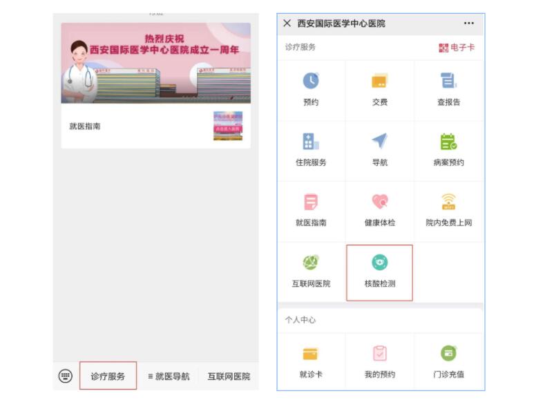 醫(yī)院核酸檢測已開通線上預約,大家可通過“西安國際醫(yī)學中心醫(yī)院服務號”微信公眾號進行預約。