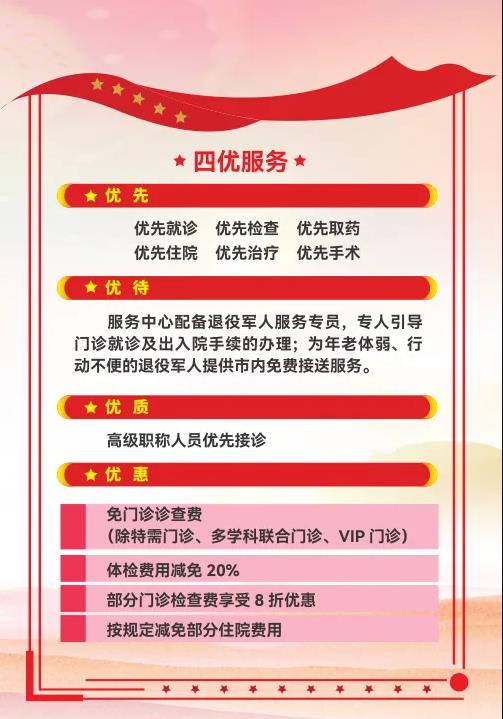 長期以來,醫(yī)院把“尊崇軍人,致敬軍屬”落到實(shí)處。一是對退役軍人實(shí)行優(yōu)撫。對退、現(xiàn)役軍人及其配偶和未成年子女;因公犧牲軍人直系親屬;軍隊(duì)離退休干部及退休士官;在鄉(xiāng)退伍紅軍老戰(zhàn)士、在鄉(xiāng)西路軍紅軍老戰(zhàn)士、“三紅”人員;殘疾軍人;在鄉(xiāng)復(fù)員軍人等優(yōu)撫對象來院享受門診就診優(yōu)先;住院優(yōu)先;窗口手續(xù)辦理優(yōu)先;檢驗(yàn)檢查優(yōu)先;城區(qū)范圍內(nèi)救護(hù)車免費(fèi)接送(預(yù)約電話:029—966120);特殊人員一對一陪診。二是優(yōu)撫對象就診時(shí)享受免門診診查費(fèi);部分門診檢查費(fèi)享受8折優(yōu)惠;體檢費(fèi)用減免20%;按規(guī)定減免部分住院費(fèi)用。