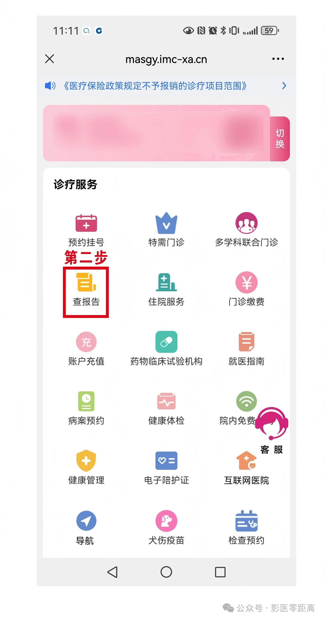 第一步:在醫(yī)院微信公眾號首頁,點(diǎn)擊底部菜單欄左側(cè)的【診療服務(wù)】入口