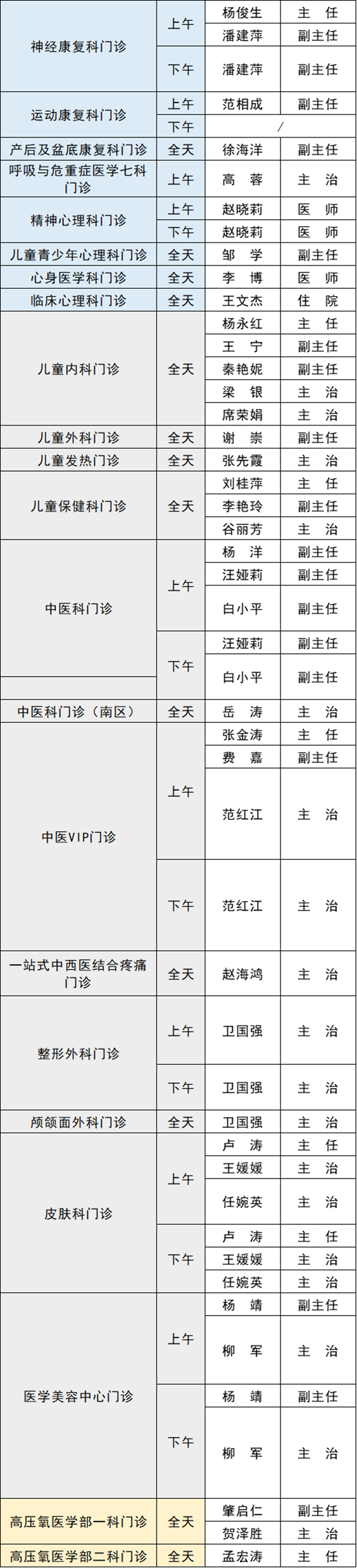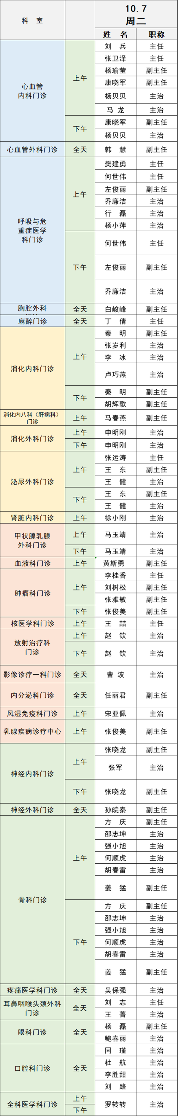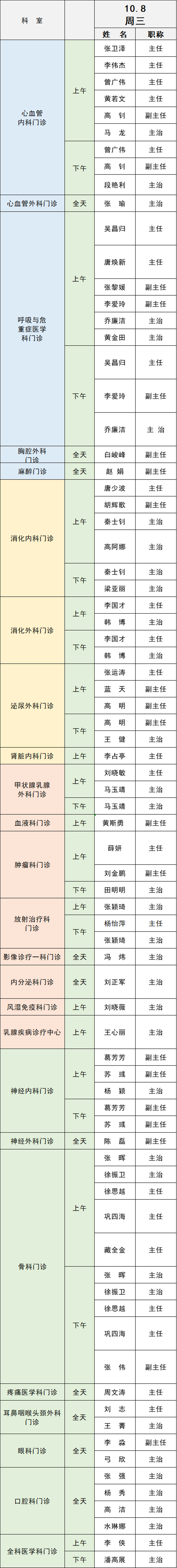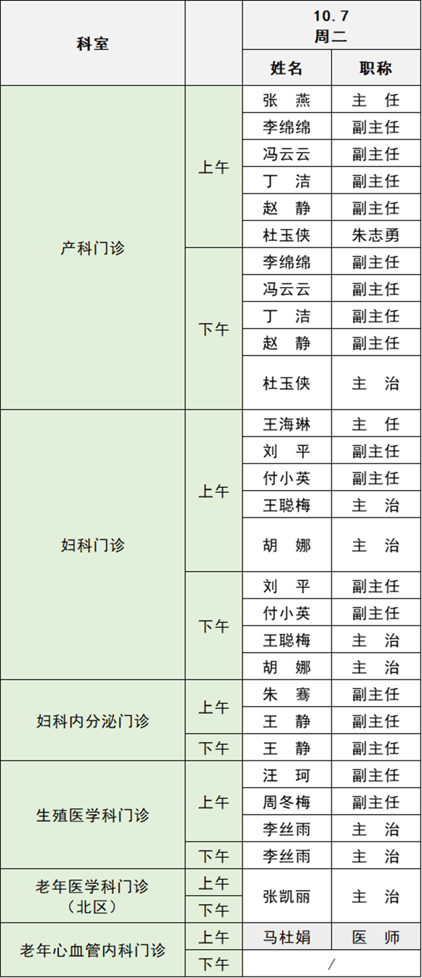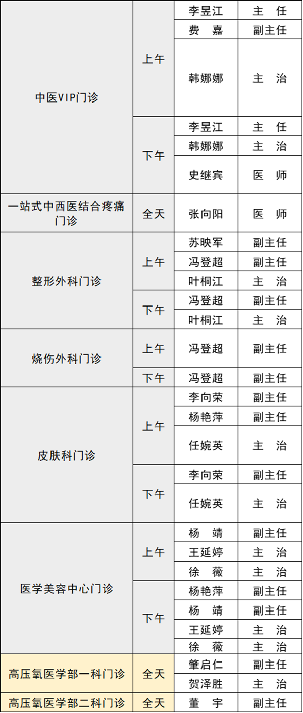 備注:實(shí)際出診情況以醫(yī)院掛號(hào)平臺(tái)實(shí)時(shí)信息為準(zhǔn)。“職稱”欄里主任=主任醫(yī)師副主任=副主任醫(yī)師主治=主治醫(yī)師