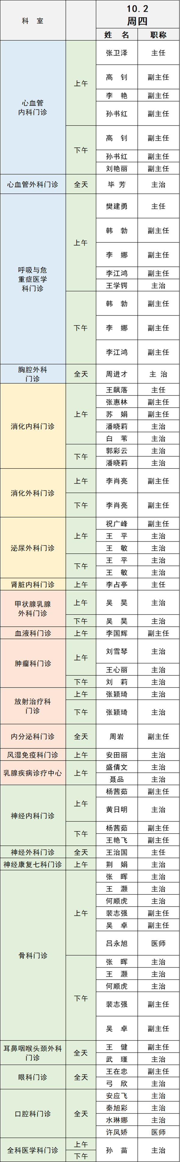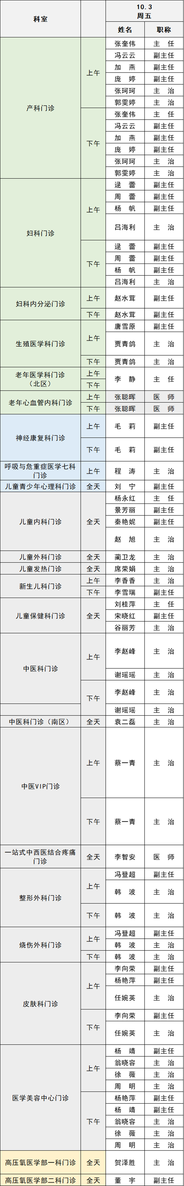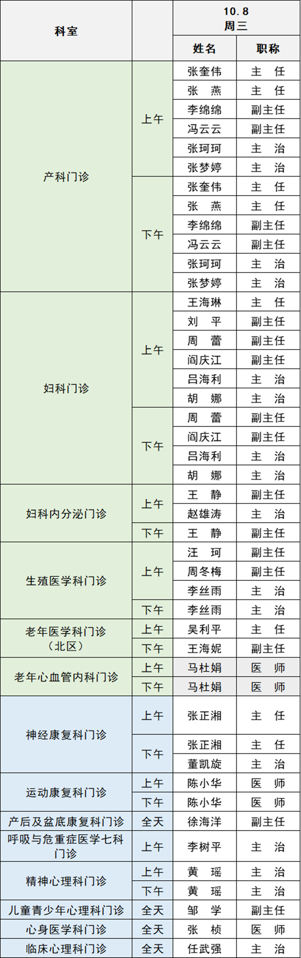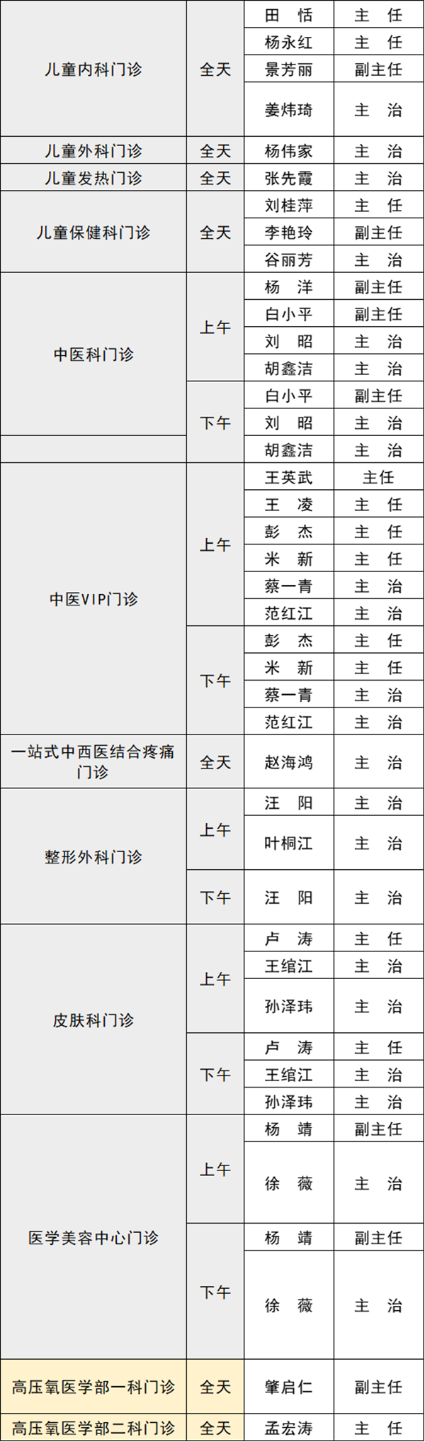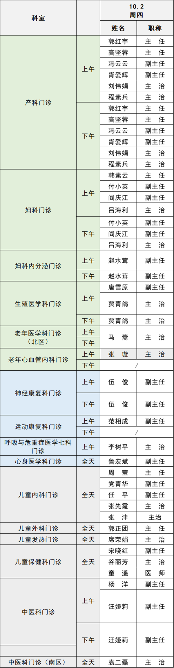備注:實(shí)際出診情況以醫(yī)院掛號(hào)平臺(tái)實(shí)時(shí)信息為準(zhǔn)。“職稱”欄里主任=主任醫(yī)師副主任=副主任醫(yī)師主治=主治醫(yī)師